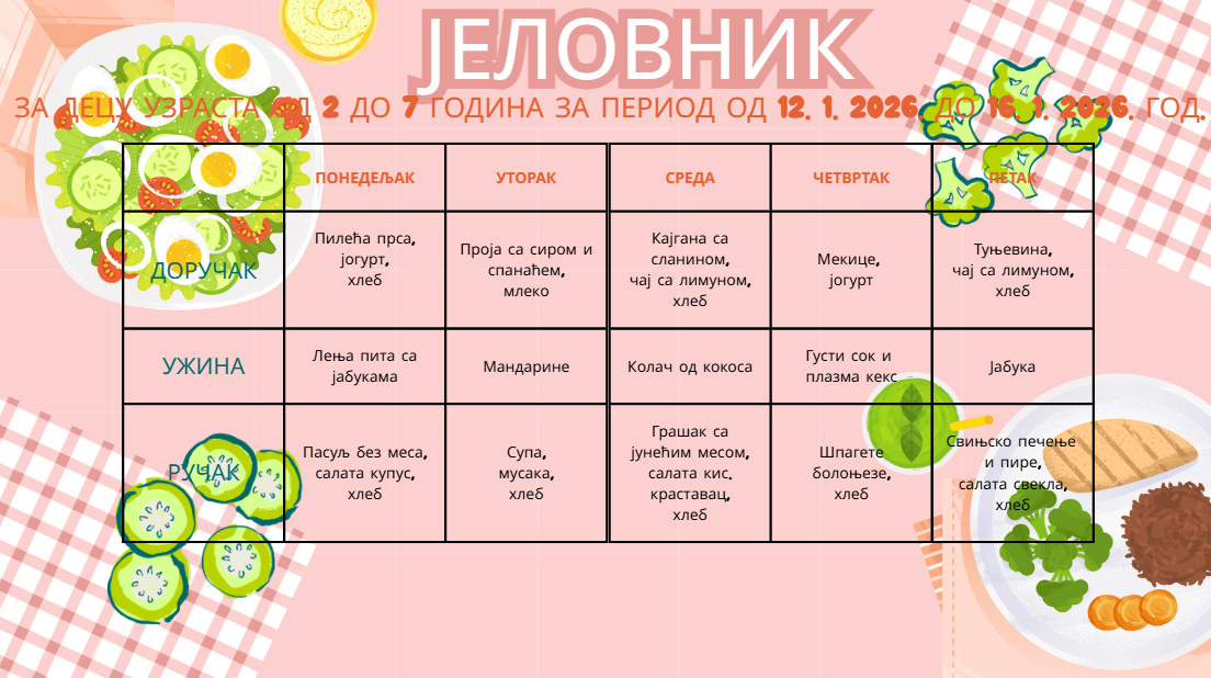 ЈЕЛОВНИК ЗА ДЕЦУ УЗРАСТА ОД 2 ДО 7 ГОДИНА ЗА ПЕРИОД ОД 12. 1.- 16. 1. 2026. ГОДИНЕ od strane adminpcelica | јан 9, 2026 | Јеловник | 0 Komentara Prosledi komentar Одустани од одговораВаша адреса е-поште неће бити објављена. Неопходна поља су означена *Коментар * Име * Е-пошта * Веб место Сачувај моје име, е-пошту и веб место у овом прегледачу веба за следећи пут када коментаришем.